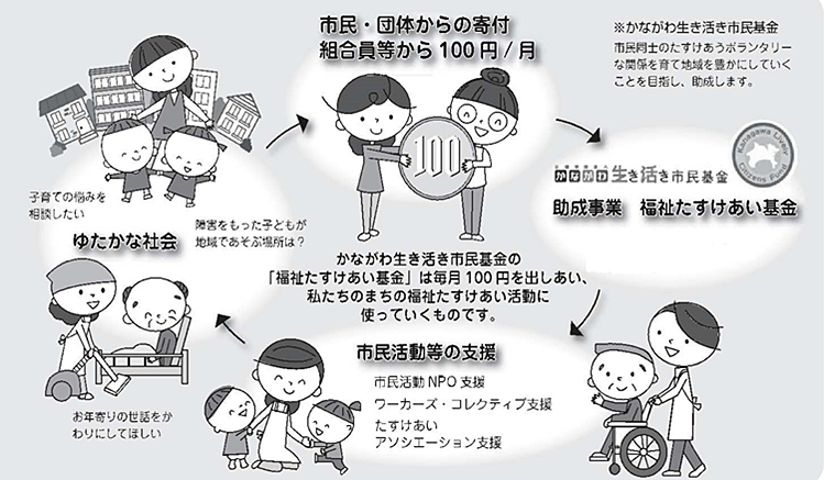 皆様より戴いたご寄付は、福祉たすけあい基金の原資として蓄積し、神奈川県内で福祉・たすけあいの市民活動や事業を行う団体・市民グループへの助成金としてお届けいたします。