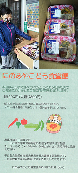 「子ども食堂宅急便」は複数の市民団体が立ち上げた緊急プロジェクトである。新型コロナで子ども食堂をやむなく中止している今、何か出来ないかと考えた。呼びかけたのは、1年前からみんなの食堂を始めた地域福祉を考える会代表の片木康子さんと子ども農園活動を6年前から主宰している一石洋子さんの二人だ。休校2か月目となった4月初め、「子どもたちにとってはやはり給食が大事」とお弁当を届けることを考えた。二宮町の教育委員会に相談すると、新型コロナの感染への不安から先生の家庭訪問を断るケースも出てきて訪問自体が中止となった。教育委員会も何か出来ないかと考えていたそうだ。そこで協働(コラボ)の話が浮上してきた。教育委員会が小中学校の保護者家庭1,800軒に送付しているレターパックに「にのみやこども食堂便」のチラシを同封してもらえることになった。申し込み受付・お弁当製造手配・配達は「子ども食堂宅急便」が担うこととした。連携のしくみが決まってからは全ての活動をスピードアップ。フードバンクかながわとの提携、町の補助金獲得(町民活動推進補助金)、市民基金の新型コロナ対応緊急応援助成への応募、お弁当製造事業者「巧味屋」との協議・・・。そして何より片木さん・一石さんたちがこれまで培ってきたネットワークの存在が大きい。毎日7~8人の配達ボランティアがお昼前の1時間、自分の受け持ちエリアの各家庭にお弁当を届け、一声かける。