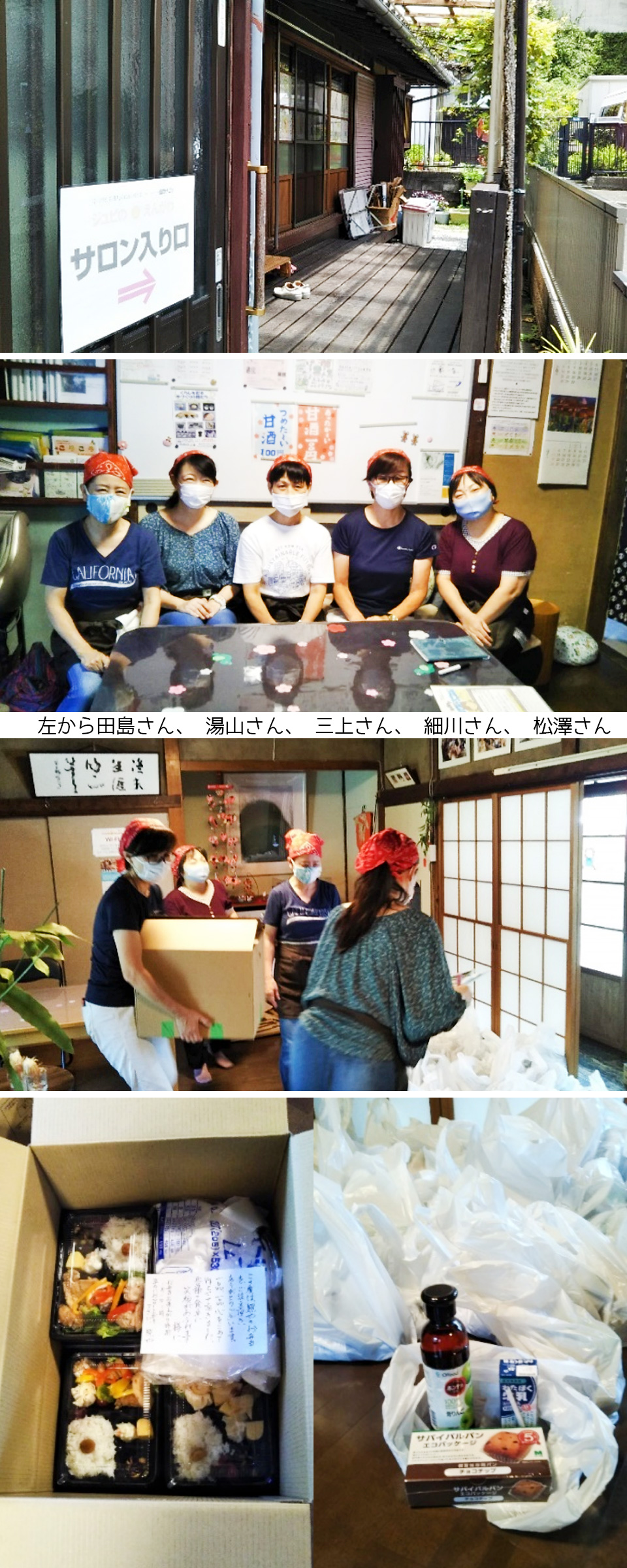 お弁当配布活動は『みんなでおうちごはん』だ。今回のお弁当配布では「照や」さん(南区井土ヶ谷の飲食店)の協力を得た。予約は電話で行う。受注担当は三上代表。予約日は二日、予約時間は枠を決めずに随時とした。今回はお弁当を70食用意、プラス『みんなでおすそわけ』も行う。食材は、青りんごジュース、牛乳パック、サバイバルパンなどだ。