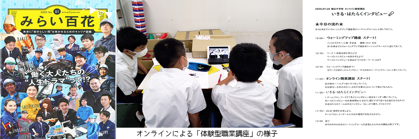 今回は、7月28日に横浜中学校で行われた、ライフデザイン教育「体験型職業講座」の様子を取材しました。当日は、校内で8つの教室に分かれて、県内の8つの企業がオンラインによる講話を行い、仕事の体験や講師との対話を通して、将来の職業や働く意味を考えるきっかけとするプログラムで実施されました。